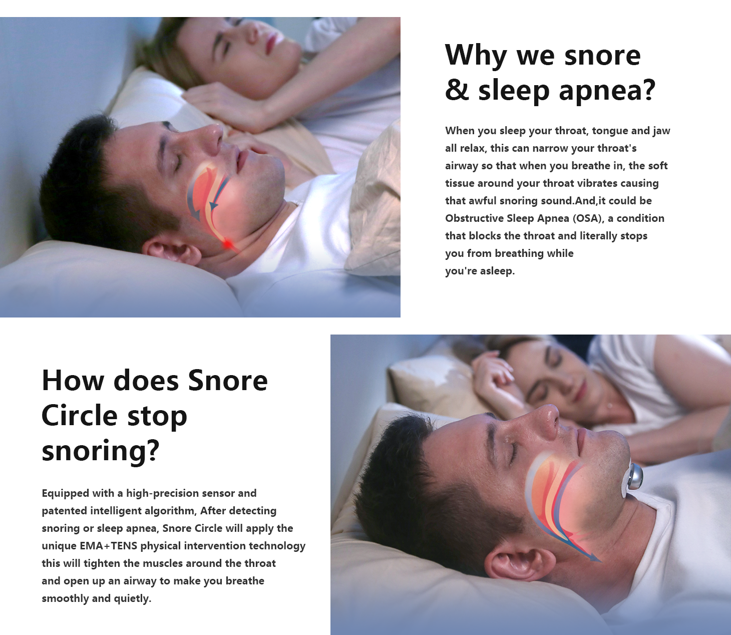 - 【How it Works】After detecting snoring or sleep apnea, Snore Circle will apply the unique EMA+TENS physical intervention technology to automatically release physical intervention at 30 different levels from weak to strong depending on the users’ condition, this weak and harmless intervention the nerves under the chin and causes the tongue to move forward which stops snoring and sleep apnea and keeps breathing smooth and quiet. Your oxygen will recover to normal level.